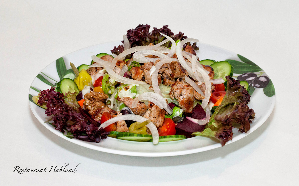 mit Schweinefiletstreifen, gemischtem Salat, Tomaten, Gurken, Oliven, Peperoni und Honig-Balsamico-Dressing