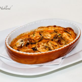 mit Metaxasoße und Käse überbacken, Knoblauchkartoffeln und Tsatsiki G
